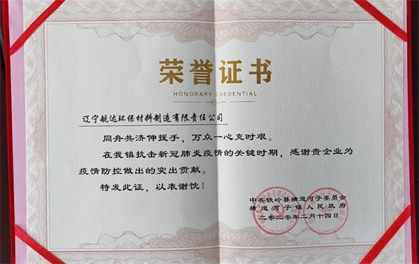 遼寧航達(dá)環(huán)保材制造有限責(zé)任公司抗擊新冠肺炎疫情捐款獲得了鐵嶺縣橫道河子人民政府頒發(fā)的榮譽(yù)證書